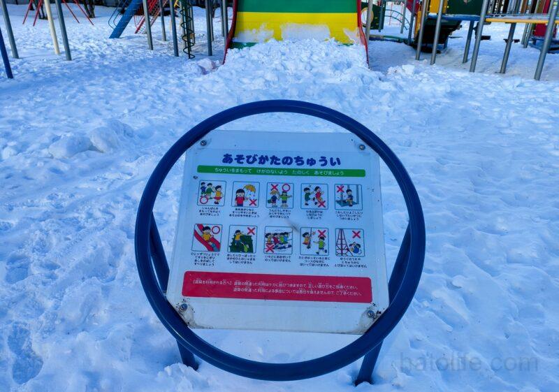 雪があるときは、遊具で遊ぶと滑って危ないので、春になってから遊びましょうね。
