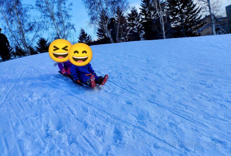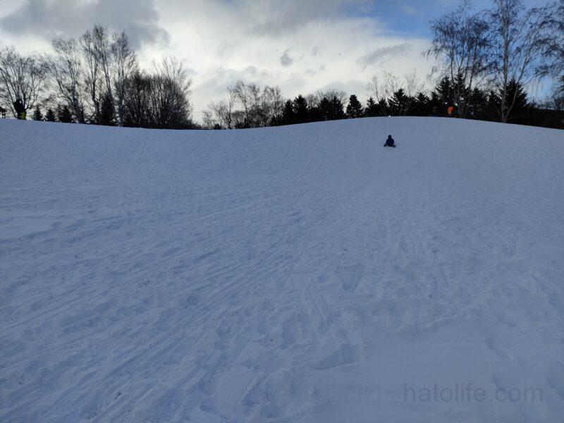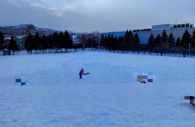 そこを登り切ると、夏季期間は野球場なのですが、冬はソリ遊びが楽しめます。