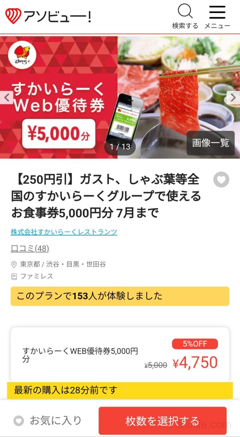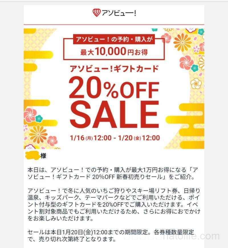 アソビューで使えるギフトカードが20%オフなので、割引されてるチケットに使用すればさらにオトクに購入できます。