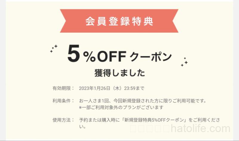 ▲この画面になるので、まず無料登録をして初回5%割引クーポンをもらってしまいましょう!