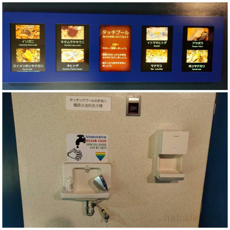水槽のなかにいる、ヒトデやナマコなどを直接触ることができます。