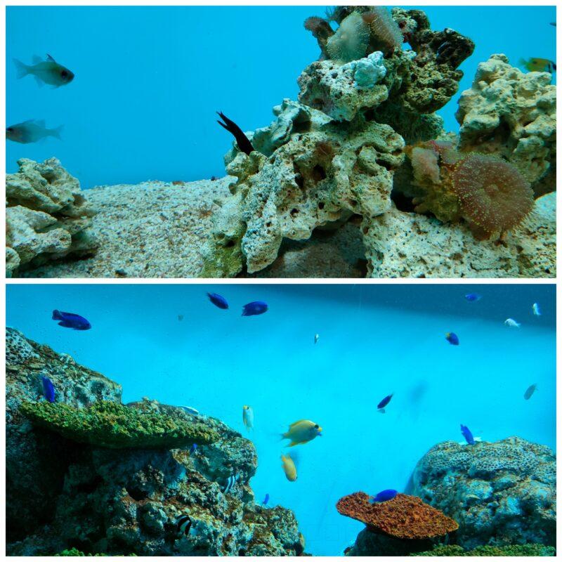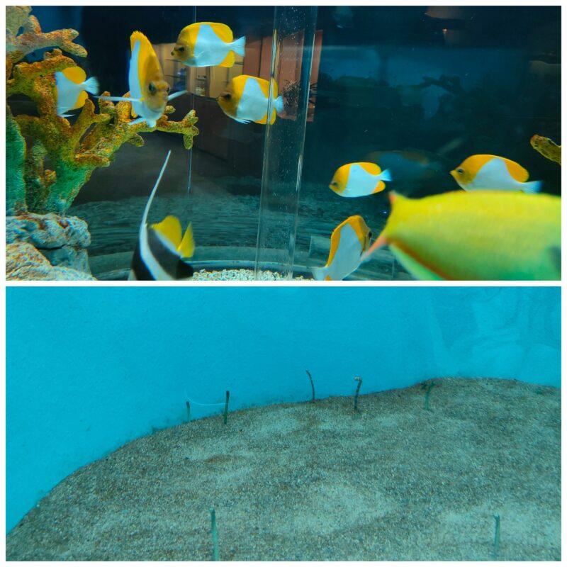 エスカレーターは水槽の上を進みます。なんの仕切りもありません!真下は水槽になっているので、落とし物注意!です。