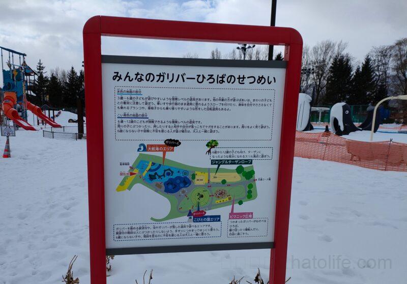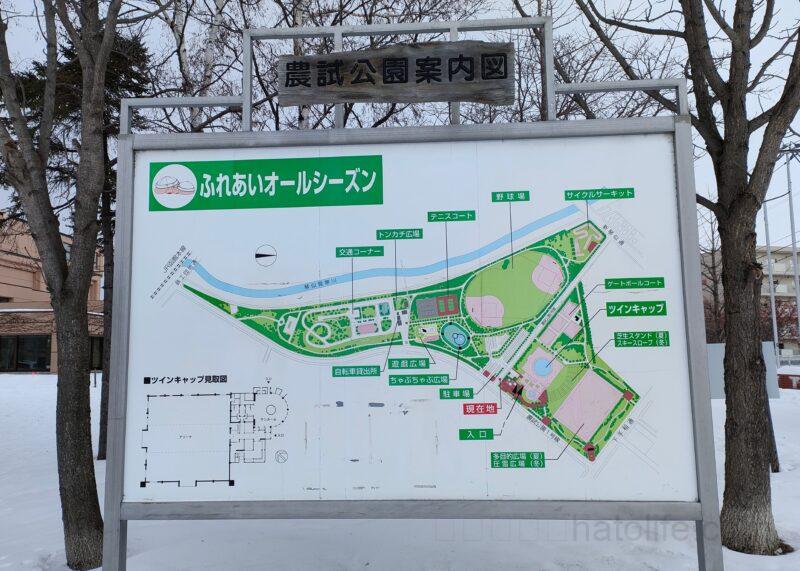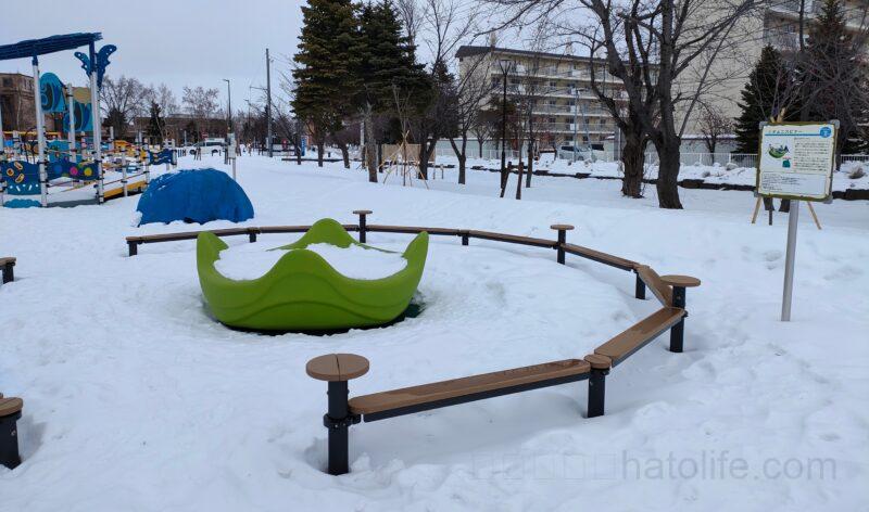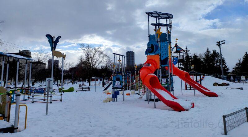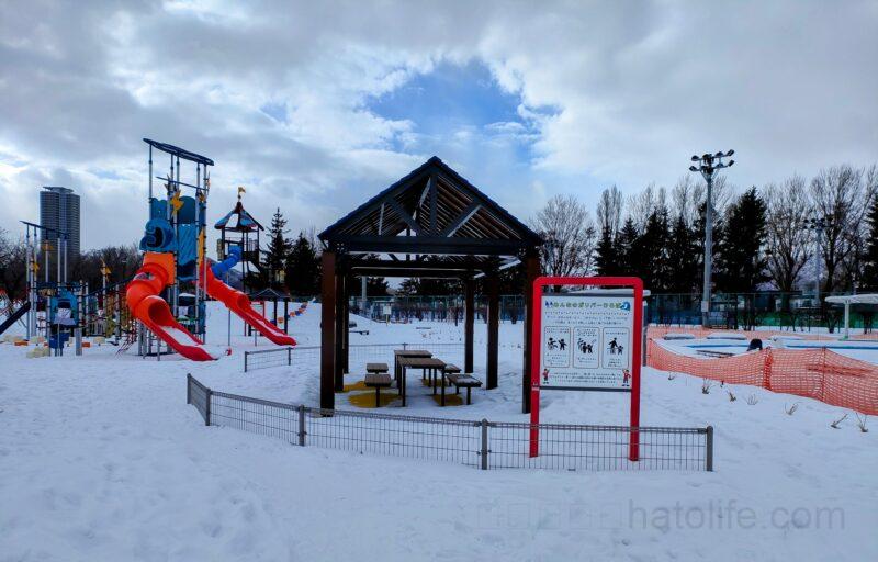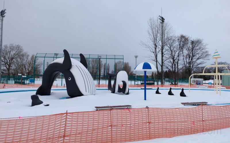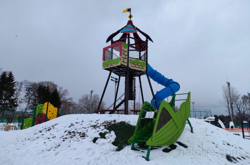 野球場やテニスコート、ゲートボール場や、自転車の練習ができる「交通コーナー」、大きいコンビネーション遊具に水遊びができる「ちゃぷちゃぷ広場」がある公園なので、雪がある時期にはあまり行かないかもしれません。