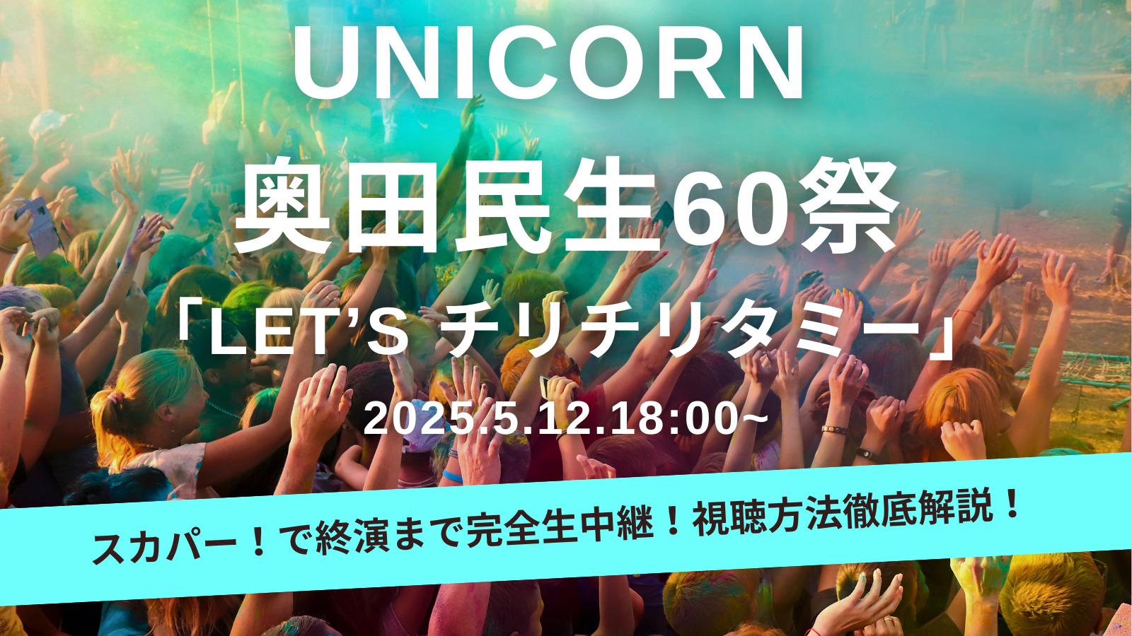 5/12(月) 18:00~、UNICORN 奥田民生60祭「Let’s チリチリタミー」の視聴方法をお伝えします。